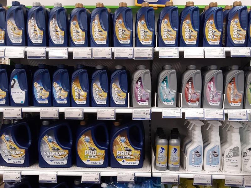 Myymälästä löytyy Nesteen voiteluaineita, autonesteitä sekä yleisempiä autotarvikkeita; polttimot, pyyhkijänsulat, puhdistus- ja hoitoaineet sekä oheistuotteet. Myymälän valikoimissa makeiset, virvokkeet, snacksit, einekset, iltapäivälehdet. Tehokaasun teräs- ja komposiittipullojen myynti ja vaihto. Veikkauspiste ja peliautomaatit.